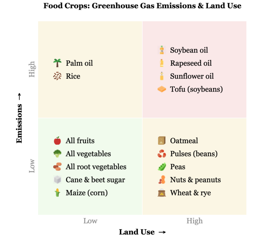 High emission crops are defined here as greater than 3 kg CO₂-equivalent per kg food product and high land use crops as greater than 3 square meters of land use per kg of food product. Vegetable oils account for up to 30% of global crop lands, but deliver less than 0.01% of the world’s important nutrients.
